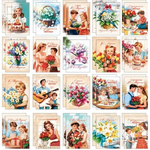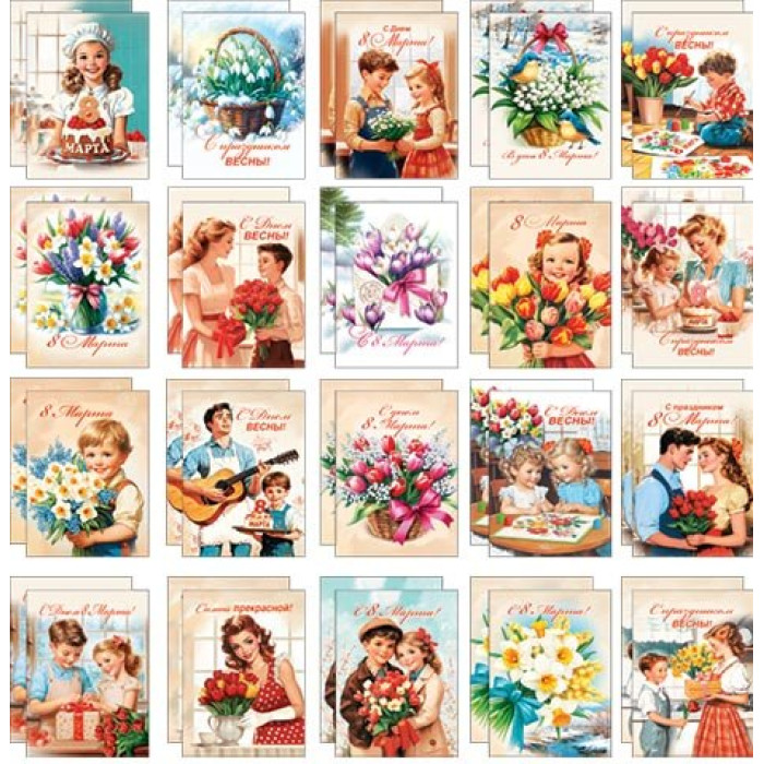 Стильно и недорого. Уникальный дизайн. Набор мини-открыток (40 шт.) Тематика: 8 Марта